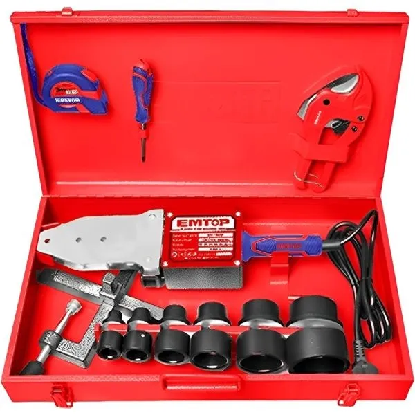 VOLTAJE: 220-240V~50/60HZ POTENCIA: 800W/ 1500W DIÁMETRO DE BOQUILLAS: 20-63MM TEMPERATURA: 0-300? P/ TIPOS: PP-R,PB,PE,PE-RT INCLUYE: - 6X BOQUILLAS 20,25,32,40,50,63MM - 1X PINZA CORTATUBOS - 1X CINTA MÉTRICA - 1X LLAVE HEXAGONAL - 1X BASE DE APOYO - 1X DESTORNILLADOR EMPAQUE: MALETÍN METALICO