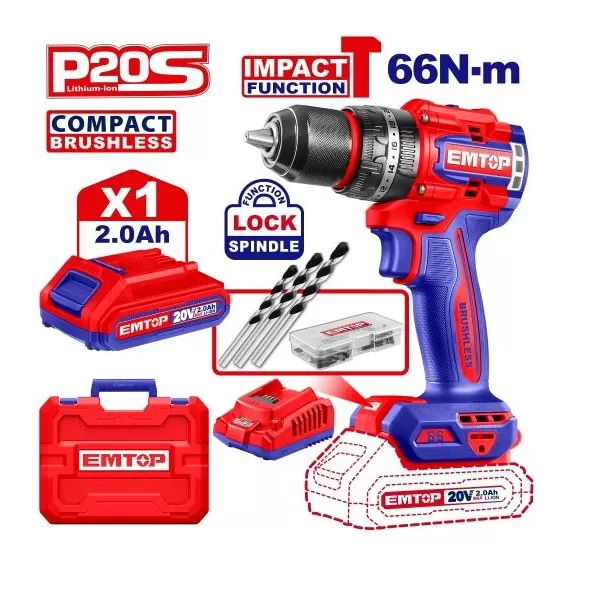 TALADRO PERCUTOR EMTOP 13MM BL 66NM 1X BATERIA 2AH