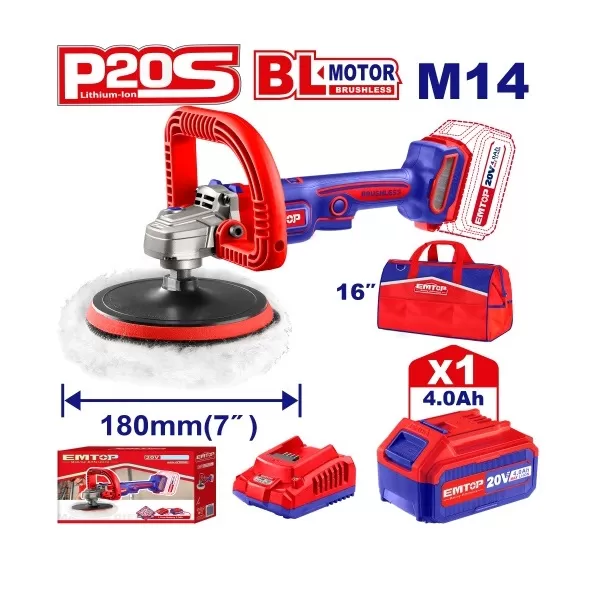 PULIDORA 180MM BL + ACC 1X BATERIA 20V 4AH EMTOP
