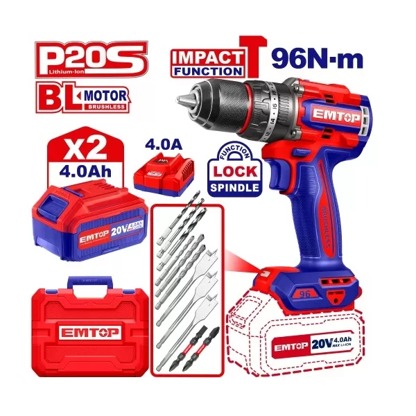 TALADRO PERCUTOR 13MM BL 96NM 2X BAT 20V 4AH EMMTOP