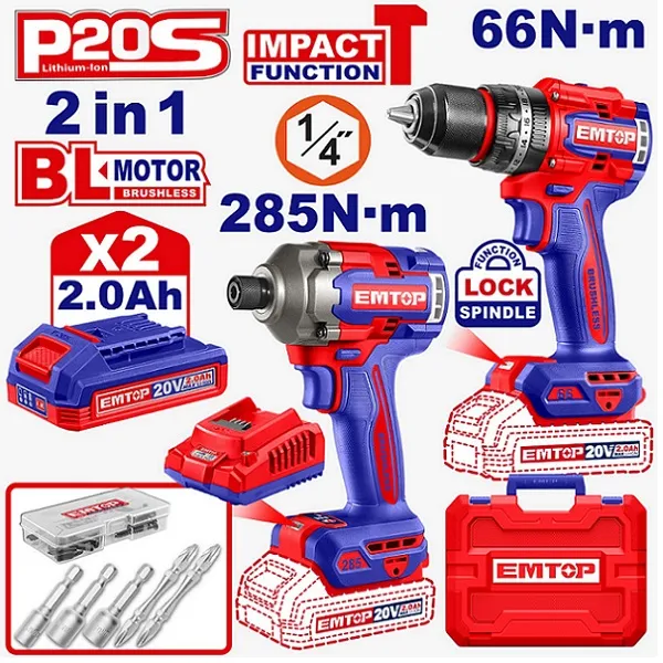 COMBO TALADRO PER + ATORNILLADOR DE IMPACTO BL 2X BAT 2 AH 20V EMTOP