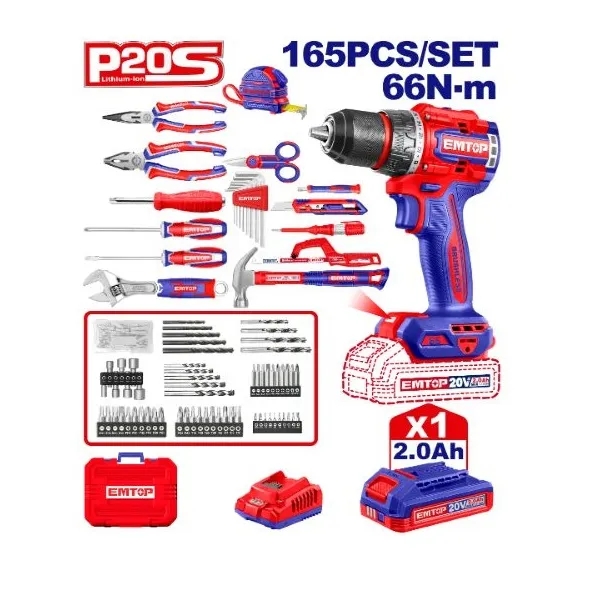 JUEGO DE 165 PZAS + TALADRO PERCUTOR 66NM 1X BAT 2AH 20V EMTOP