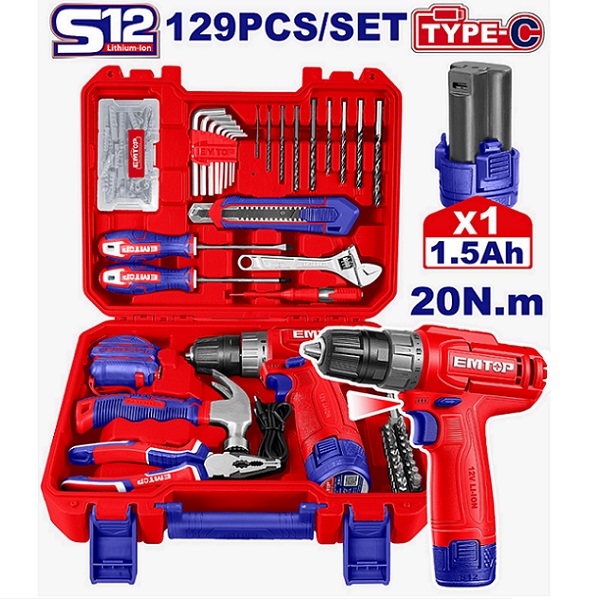 JUEGO DE 129 PZAS CON ATORNILLADOR 12V EMTOP