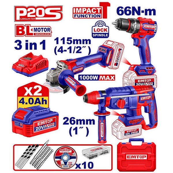 COMBO 3 EN 1 TALADRO + AMOLADORA + ROTOMARTILLO BL 2X BAT 4AH EMTOP